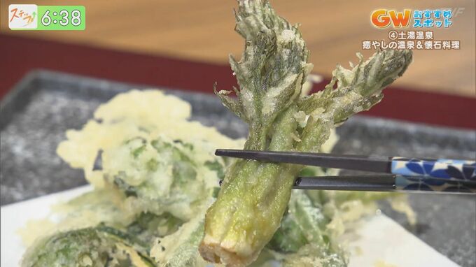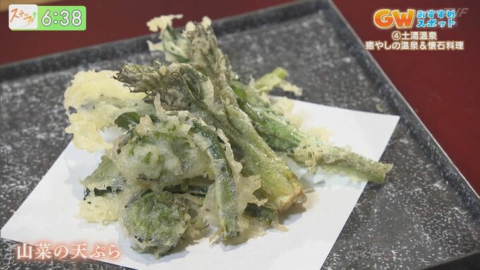次にいただいたのは、土湯で採れた『山菜の天ぷら』。旬のタラの芽をいただきます。