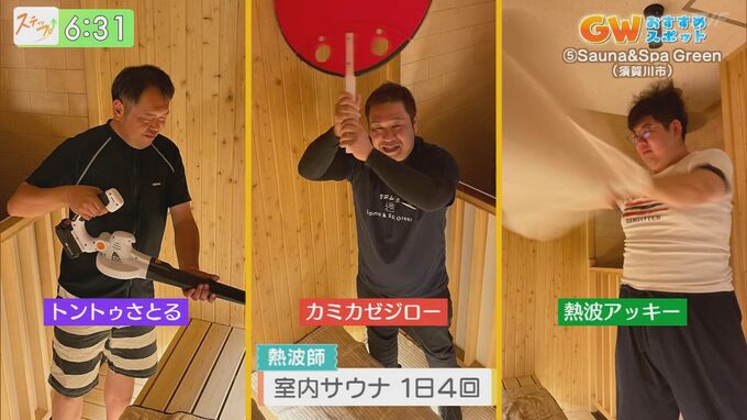 熱波師のサービスが人気なんです。灼熱王子 まさおさんのほかにも、個性的な熱波師さんが!普段は1日4回、室内サウナでのみ体験できます。