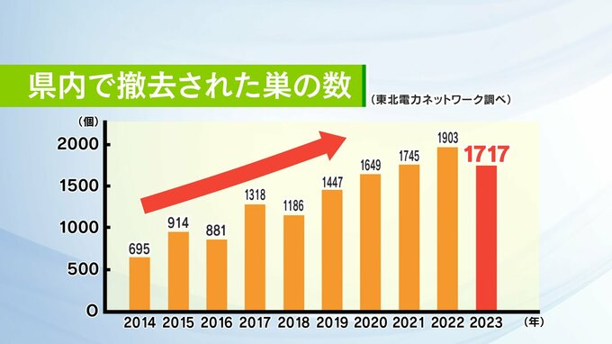 一方、東北電力ネットワークが撤去したカラスの巣の数は、去年1年間では1700個を超えていて、10年前と比べると2倍以上に増えています。平均して、毎日5個から6個撤去している計算になり、こうした電力会社の努力があるからこそ、停電がそこまで多くならずに済んでいるのです。
