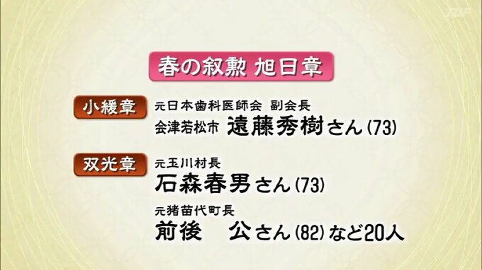 春の叙勲 福島県内からは75人が受章 2024年4月29日(月) 12:17 国内 様々な分野で功績を残した人に贈られる春の叙勲の受章者が発表され、福島県内からは78人が受章しました。地方自治など、社会の様々な分野で顕著な功績を挙げた人に贈られる旭日章では、小綬章に元日本歯科医師会副…
