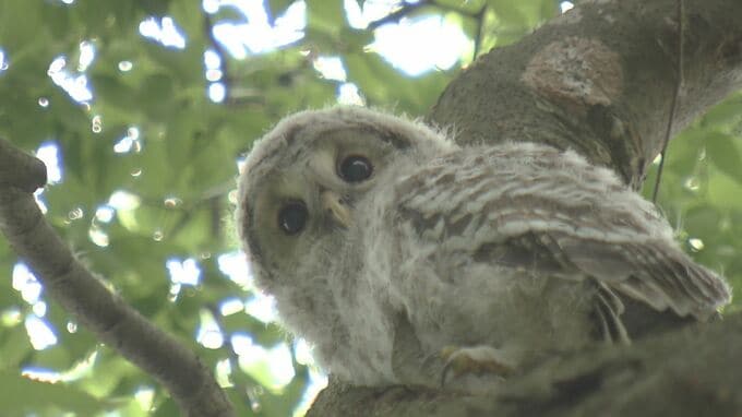 近所の人によると、フクロウの赤ちゃんは、毎年巣を出て羽ばたく練習を始めてから1週間ほどで別の場所へ飛び立っていくということで、今年も今週末から来週くらいまで見られるのではないかということです。