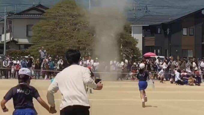 こちらは、11日に福島市の野田小学校で撮影された映像です。グラウンド上に渦を巻いた突風が発生しています。