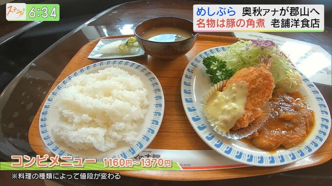 --奥秋アナ「きたきたきた~!ありがとうございます!さあこれが、コンビメニューのセットになります。洋食屋さんなんですけれどもおみそ汁とか漬物が付いている、これがまたいいんですよね~。そして私がよく食べる〝井坂煮″とエビの〝ボンマリ″。ボリューム満点じゃないですか?」