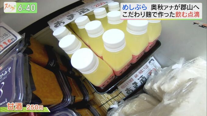 --奥秋アナ「こんにちは、いつもお世話になっております。さあ、ということで商品を見てみましょう。ずらりと並んでいますね。〝もろみ″に〝にんにく味噌″でしょ。それから〝塩麹″などもありますね。ただ私がきょうご紹介したいのがこちらの〝甘酒″です。」