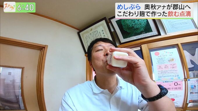 --奥秋アナ「では早速、甘酒いただきま~す。ん~、この優しい甘みがたまらないですよね。またお米の食感も感じられますので、すごくその食感も楽しめるんですよね。」