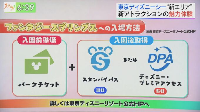 ファンタジースプリングスへの入場と、エリア内の対象アトラクションを使用するには、東京ディズニーシーのパークチケットの他に、スマートフォンアプリを活用した無料の整理券「スタンバイパス(無料)」または、短い待ち時間でアトラクションに乗ることができる有料のサービス「ディズニープレミアアクセス(有料)」の取得が必要となります。