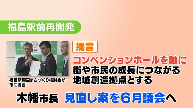 これまで、駅周辺のまちづくりについて話し合いを進めてきた委員会は16日、木幡市長に対し、提言を提出しました。提言では、コンベンションホールを軸に、街や市民の成長につながる地域創造拠点とするよう求めています。木幡市長は、駅前再開発の見直し案を6月議会に提出する方針です。