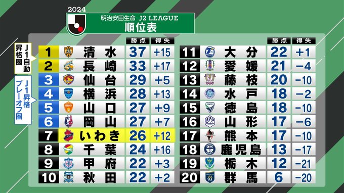 いわきは勝利しましたが、他の上位陣も勝利したため、順位は変わらず7位です。しかし、3位までの勝ち点差はわずか3で、上位を狙える位置につけています。