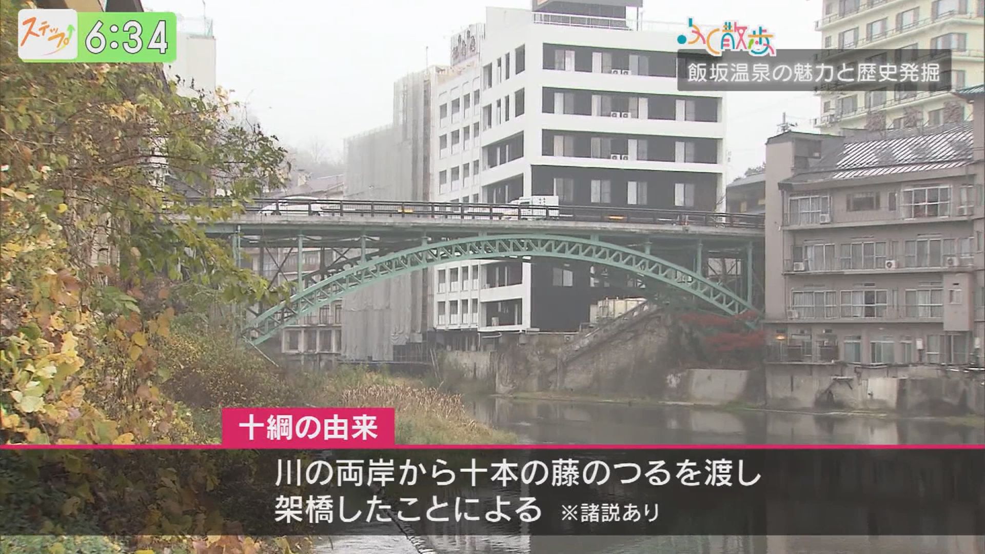 ここでさらに気になるものが。『十綱橋』。名前の由来は平安時代、川の両岸から10本の藤のつるを渡して、橋を作ったことによるとも言われています。現在の橋は大正時代にかけられ、現存する銅製アーチ橋の中で、最も古いと言われています。飯坂温泉街を流れる摺上川に架かる全長52mのアーチ橋で令和2年には、国登録有形文化財にも選ばれたんだって。飯坂のシンボルなんですね。
