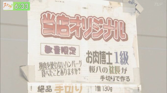郡山市安積町にあるお肉屋さん『桜八』。入口には、何やら気になるチラシが。「ひき肉を使わないハンバーグ」?「お肉博士1級」?一体どういうことなんでしょう。これはお店で聞いてみるしかないですね。すみません、「お肉博士」って何ですか?