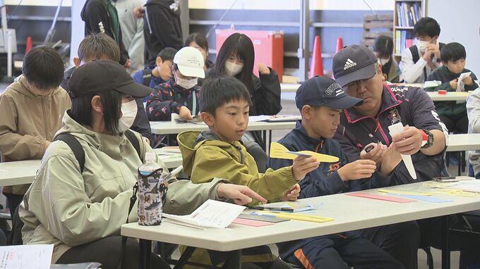 スカイスポーツの魅力を知り、航空について学ぶこの教室には、福島県内の小学生とその保護者約150人が参加しました。小学生たちは尾翼や重りの位置を調節することでアクロバット飛行ができる飛行機作りに挑戦しました。