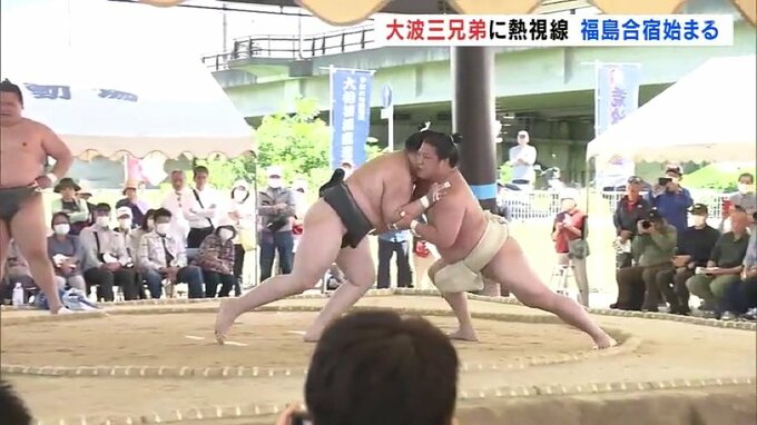 福島市の相撲場で始まった、荒汐部屋の福島合宿。福島市出身の大波三兄弟がそろい踏みし、次男の若元春に、三男で先場所で十両優勝を果たした若隆景、さらに長男の若隆元も朝稽古を披露しました。