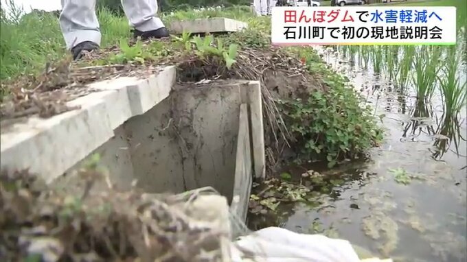 梅雨を前に、水害対策のひとつとして、水田の「水を貯める機能」に注目した、いわゆる「田んぼダム」の取り組みが広がっていて、7日、初めて現地で説明会が開かれました。