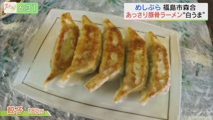 --奥秋アナウンサー「今回、こちらのお店をご紹介するにあたって、どうしてももう一つ、ラーメン以外に紹介したいものがありまして。それがこちらの餃子。5個セットでなんと180円です!」