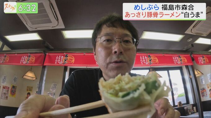 --奥秋アナウンサー「では、いただきます!まずはスープからですね。あっさりマイルド!実は私、本場のとんこつラーメンって若干臭みが気になってちょっと苦手なところがあったんです。しかし、ここのとんこつラーメンは本当にあっさりしていて、臭みが全然ないんですね。スープとよく絡んでおいしいですね。」