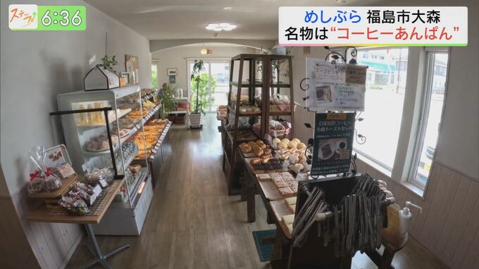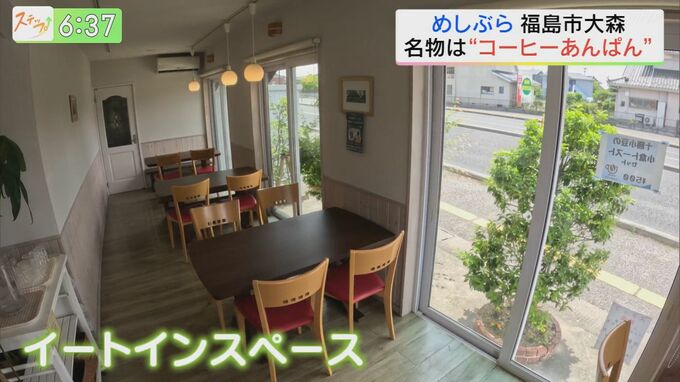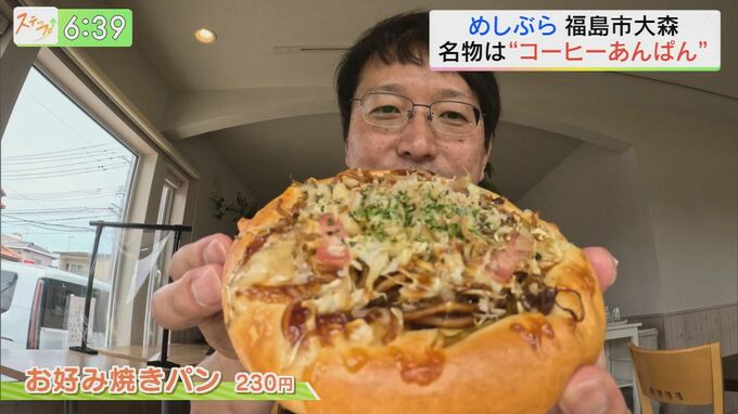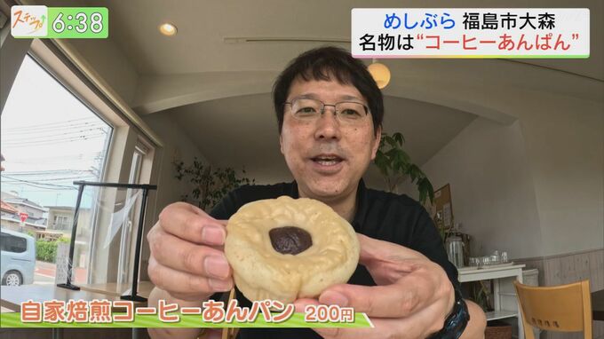--奥秋アナウンサー「では早速いただきたいと思います。まずはこちらの『コーヒーあんぱん(200円)』。珍しいですよね。ちょっと割ってみますと・・・あんこ、そしてちょっとクリームも入ってますかね。いただきます。ん~!口に入れた瞬間、コーヒーの香りがふわっと香ってきてそのあとにマスカルポーネチーズとあんこの組み合わせが絶妙でおいしい。」