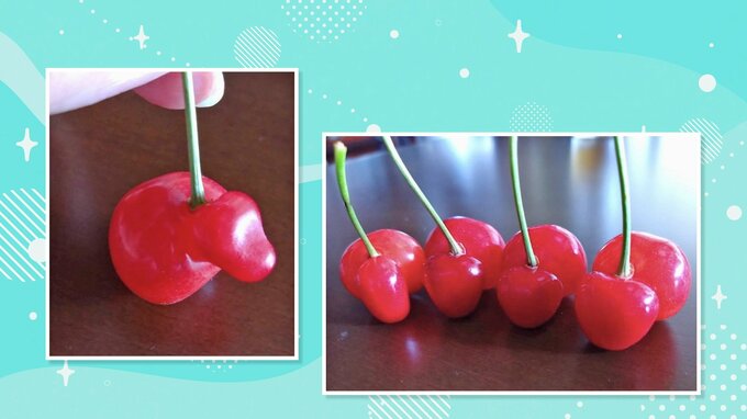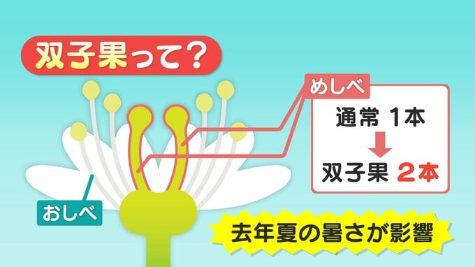 本来、サクランボの花にはめしべが1本ありますが、これが2本になったことで実が2つくっついて生育します。原因は、花芽が作られる去年の夏の猛暑が影響しているとみられています。