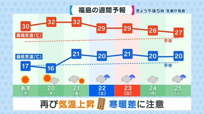 福島市のこの先1週間の予想気温を見ると、最高気温は18日より8℃ほど高い30℃台が並んでいます。気温差が大きくなりますので、体調管理にお気を付けください。