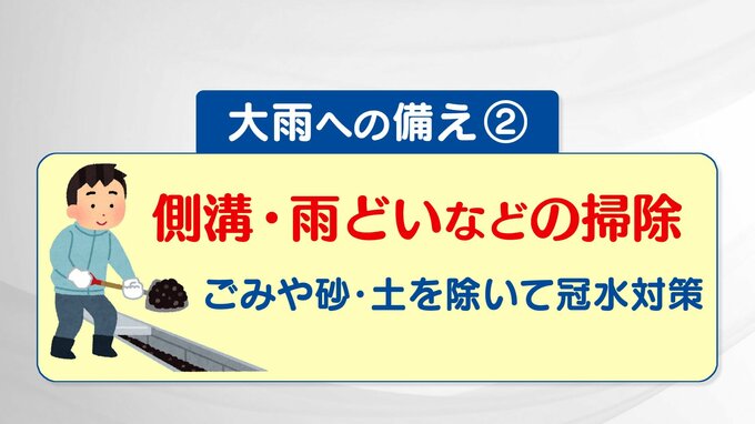 側溝や排水溝、屋根の雨どいの掃除をしておきましょう。ここに土やごみ、落ち葉が溜まっている、と雨水が上手く流れずあふれ出す可能性があります。大雨のシーズンに入る前に備えておいてください。