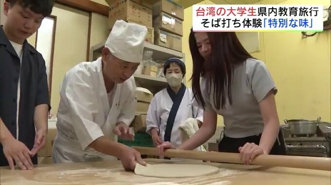 磐梯町にある「道の駅ばんだい」でそば打ちを体験したのは、台湾の銘伝(めいでん)大学の学生たちです。この取り組みは、県内への教育旅行の一環で行われたもので、台湾の大学生たちは、職人から指導を受けながらそばの打ち方を学んでいました。