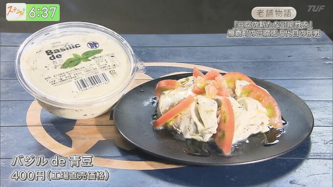 4年前に誕生したのが、こちらの「バジルde青豆(400円・工場直売価格)」です。人気商品になった青豆の寄せ豆腐に粉末のバジルを混ぜ洋風にアレンジ。