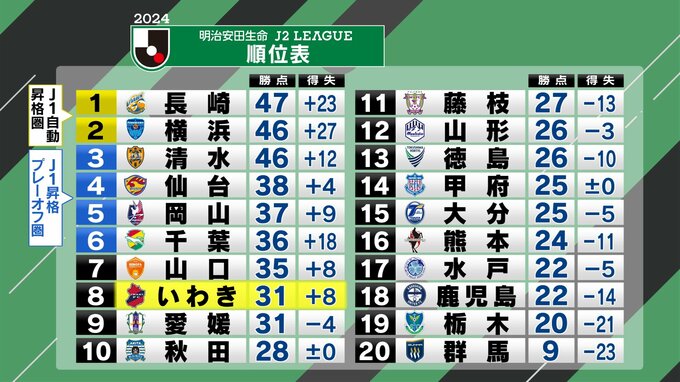 いわきは連敗となりましたが、順位は変わらず8位のままです。昇格プレーオフ圏内の6位との勝ち点差は5に開きました。