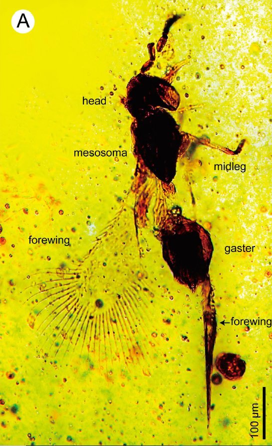 チサトムカシホソハネコバチは、体長0.4ミリ。世界最小級のハチの仲間で、肉眼では見ることができないため「偽妖精バチ」とも呼ばれています。ムカシホソハネコバチの仲間の化石が発見されるのは国内では2例目で、いわき地方のコハクからは初めての新種です。また、雄雌ともに発見されていて、雌雄で発見されたムカシホソハネコバチ属は世界3例目だということです。
