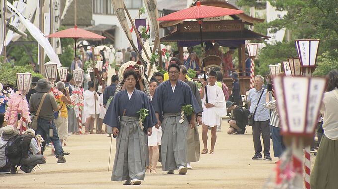 行列には、地元の人およそ100人が参加し、魔除けの獅子頭を先頭に天狗に扮した道案内役の猿田彦や、白装束姿の子どもたちが練り歩きました。梅雨の晴れ間の中、伝統の祭りを一目見ようと、およそ2000人の観光客が訪れていました。