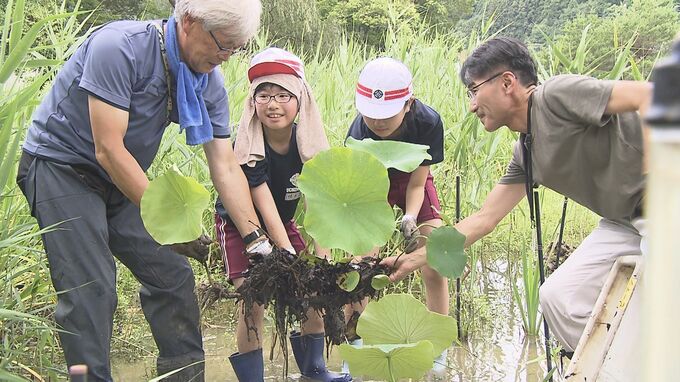 この数年、カメとみられる食害や、去年の豪雨による被害でハスが減っていて、地元の小学生がハスを守る取り組みを進めていました。8日は、小学生が種から育てたハスの苗を初めて池に植えました。