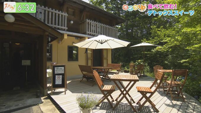 森の中に佇むレイクウッドカフェ店にはウッドデッキもあり、自然の中でゆったりとティータイムを過ごせます。