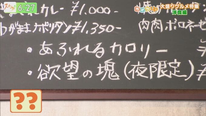 どんなガッツリ飯があるのか、メニュー表を見てみると・・・?『あふれるカロリー』、『欲望の塊』?これは気になりますね。