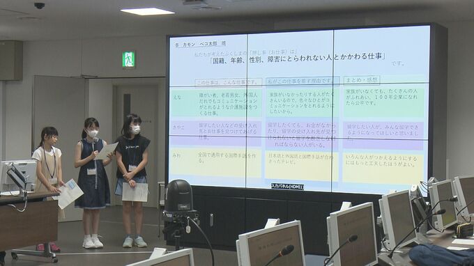 県内の小学5、6年生14人が参加し、4つのグループに分かれて、ドローンやロボットなどを活用した仕事や、ツアーを通じて福島の魅力を発信する仕事など、将来、福島にあったらいいなと思う仕事について、内堀知事に発表しました。