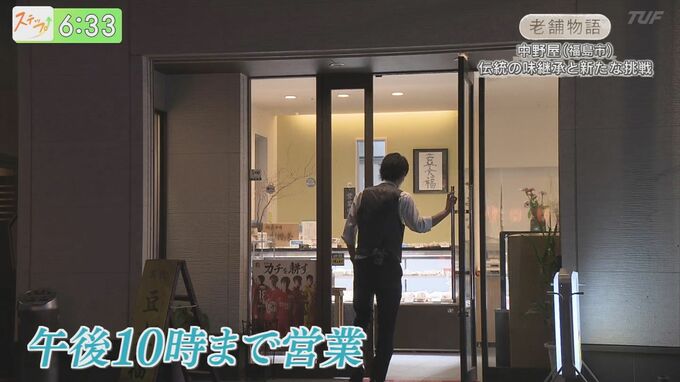 そして、最大の特徴は営業時間です。和菓子店なのに営業は午後10時まで。3代目の吉弘さんが夜もスイーツを求めている人が意外と多いことに気づき、およそ35年前から始めました。遅い時間帯も客足が途絶えません。名物・塩豆大福も、営業時間が長いことから、朝、昼、夜と時間を分けて作るようにしているといいます。