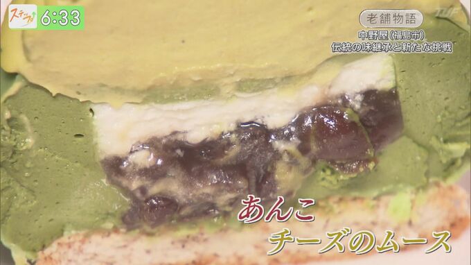 知弥さんのこだわり。それは、福島県産のフルーツを使用すること。そして、和菓子屋に置く洋菓子らしく、和洋折衷の一品を必ず並べておくこと、この2つです。この日、ショーケースに並んでいたのは、ピスタチオのクリームと抹茶のコーティングが施されたスイーツ。中には、あんことチーズのムースが2層になっています。まさに和と洋を一度に楽しめる一品。和菓子屋である中野屋だからこそ生まれた商品です。