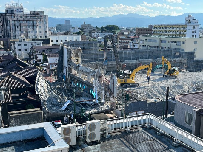 事故があったのは会津若松市中町の商業ビル「旧会津ロイヤルプラザ」の解体工事現場です。消防によりますと、1日午後2時40分ごろ「解体現場の足場が崩れ、道路をふさいでいる」と、付近の人から通報がありました。