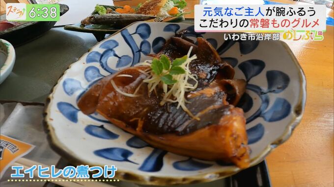 甘く味付けされたエイヒレの煮つけはホロホロ食感でごはんが進みました。