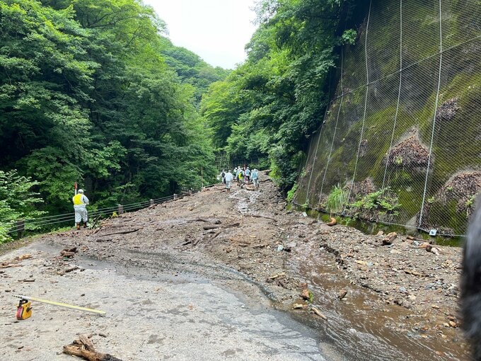 小枝佳祐記者「道路には大量の土砂が流れ込んでいて、現在は復旧に向けた調査が行われています」