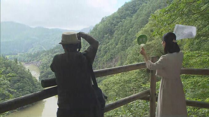 あわせてJR只見線の列車と橋りょうが見える三島町のビューポイントにお立ち寄りになり、高台から列車に旗を振ってエールを送られました。