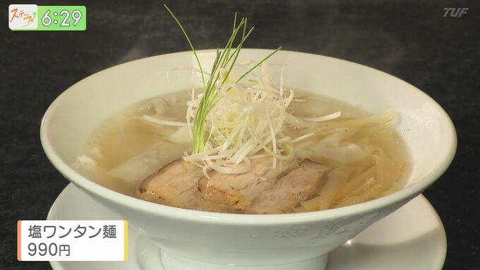 看板メニューは塩スープでワンタンを味わう『塩ワンタン麺(990円)』。昆布出汁のコクがありながら、すっきりとした後味の塩スープとともに、特製のワンタンを楽しめる一杯です。
