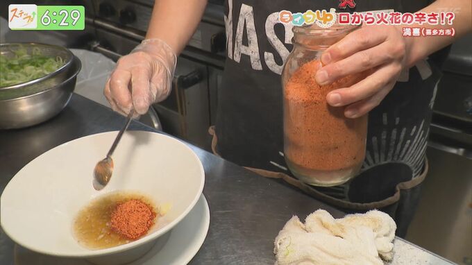 ベースの塩ダレに独自にブレンドした大量の唐辛子を投入。さらに、企業秘密だという辛みの素を加えます。