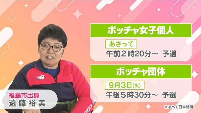 ボッチャ代表で福島市出身の遠藤裕美選手は、個人戦と団体戦に臨みます。個人戦の予選は31日未明、団体戦の予選は9月3日に行われる予定です。