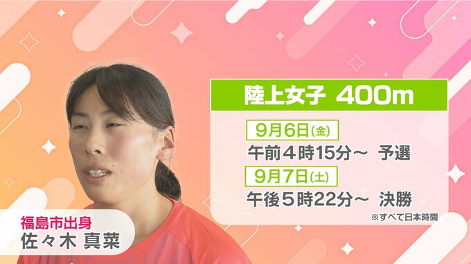 福島市出身の佐々木真菜選手が挑む陸上女子400メートルは、9月6日に予選、7日に決勝が行われる予定です。