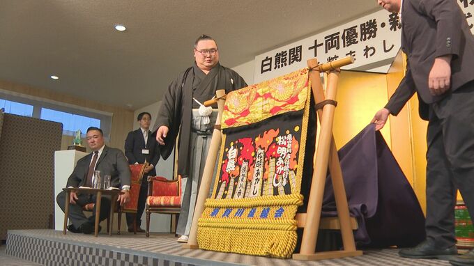 31日は地元・須賀川市で十両優勝を祝う祝賀会が開かれ、後援会の会員などおよそ200人が集まりました。また、関取が土俵入りの際に締める「化粧まわし」が後援会から贈られ、受け取った白熊は、秋場所への決意を新たにしていました。