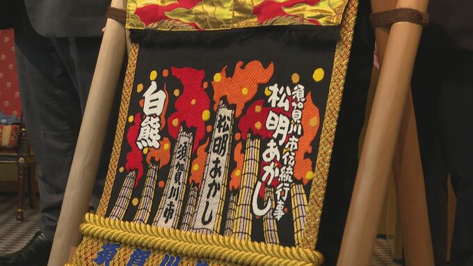 大相撲で先場所十両優勝を果たした福島県須賀川市出身の白熊の祝賀会が8月31日に開かれました。初の幕内で迎える秋場所へ期待を込めて、化粧まわしが贈られました。