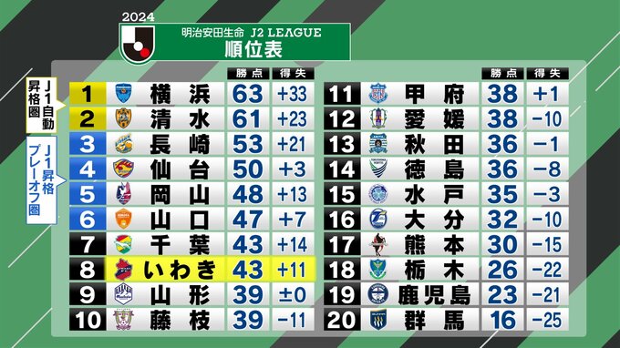 いわきは敗れて順位を8位に落としました。昇格プレーオフ圏内の6位との勝ち点差は4に広がり、昇格に向けて踏ん張りどころを迎えています。