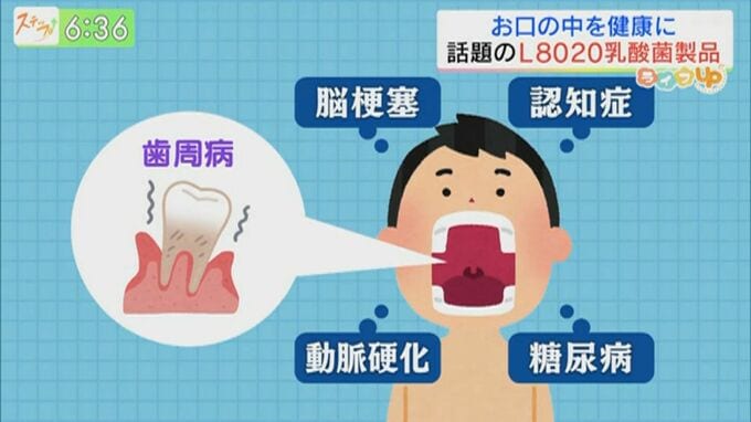 --二川浩樹 教授(広島大学)「(歯周病菌は)糖尿病が悪化したり動脈硬化症を悪化させて、脳血管症や心疾患の原因になったり。高齢の方であればアルツハイマー病を悪化させることが知られているんですけど、そういうL8020乳酸菌が出している抗菌物質で歯周病菌の毒素を不活性化できることが分かっています。」