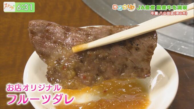 こちらも1頭からわずか数キロしか取れないザブトン。脂と肉のうま味を存分に味わえます。お店オリジナルのフルーツダレで食べるのがおすすめ。お肉の脂の甘みが相まって、私も食べたくなってきました。
