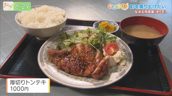 浪江町を盛り上げるために始めたこのお店。現在も以前の精肉会社からの質の良いお肉を直接仕入れています。そんなお店の人気メニューがこちら。食べごたえ満点の『厚切りトンテキ(1000円)』。肉厚の豚肉は、外側がカリッとしながらも、中は柔らかく、少しとろみを感じる甘じょっぱいタレがしっかりと絡まっています。