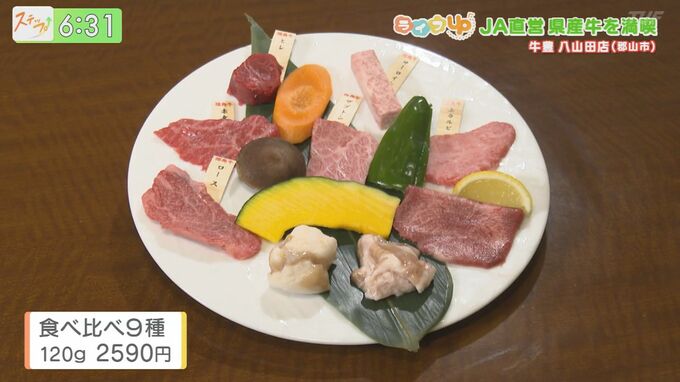 おすすめメニューがこちらの『食べ比べ9種(120g 2,590円)』。福島牛を1頭買いすることでヒレやザブトンなど、なかなか食べられない希少部位も。サーロインはサッと焼くだけで脂がじわっとあふれてきます。
