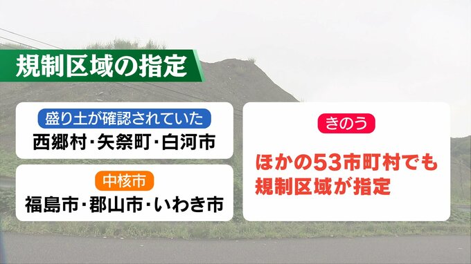 県内では盛り土が確認されていた西郷村、矢祭町、白河市と中核市の福島市、郡山市、いわき市で先行して規制区域が指定されました。そして24日、残る53市町村についても規制区域が指定され、これで県内全域で適用されることになりました。